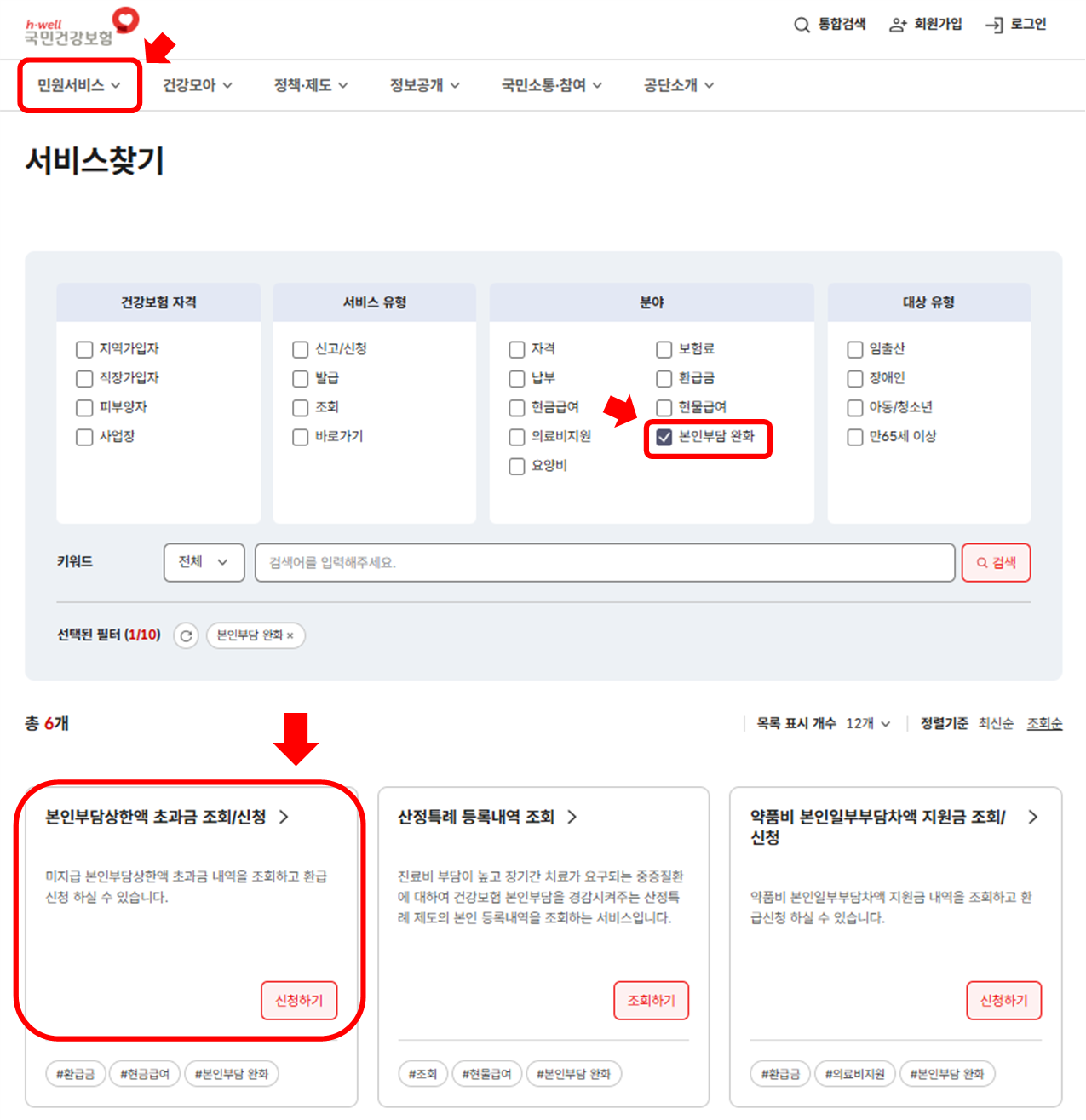 - 경로: 민원 신청 → 보험급여 → ‘본인 부담 상한액 초과금 조회’
