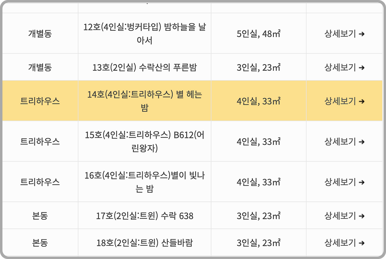 - 트리하우스 14~16호 (3개) : 2층으로 꾸며진 분위기 있는 단독 숙소